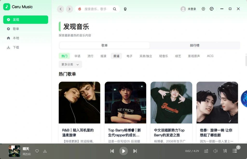 这是一个开源免费的听歌神器,只需要导入免费的音乐源,即可实现免费听歌,它同时支持windows,linux,mac.并内置多个引擎,能够在线聆听,还自带有桌面歌词,样式调整,支持多种音质选择,歌单广场涵盖多种风格、场景、主题包括排行榜单实时更新,顶部也具有搜索功能,还有听歌识曲,支持歌单管理。还可以导入本地音乐文件,具有文件夹扫描工具等。