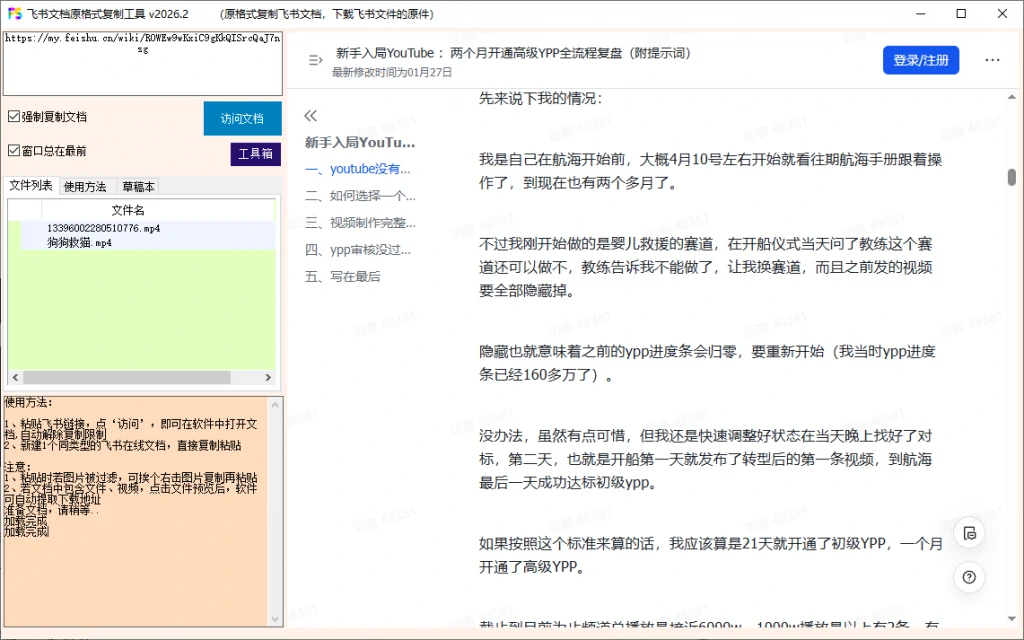 飞书文档已经成为越来越多个体与组织分享知识、沉淀经验的首选平台,大量用户通过它来收集和整理学习资料、笔记思考,我们也常常在飞书上发现那些让人眼前一亮的干货内容,从行业洞察到实战经验,从方法论到操作指南……但是很多都无法下载,前面给大家分享了个脚本,但是无法原格式下载视频和表格等,所以本期给大家安排这个软件