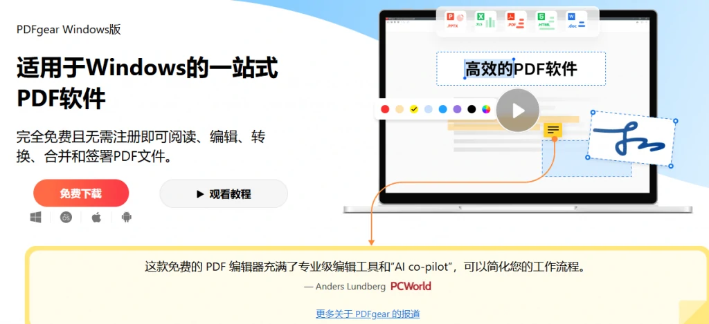 PDFgear是一款功能强大且免费的PDF处理软件。它具备丰富的核心功能,包括文档编辑(可自由处理文本、图像、形状等,还能添加签名、链接和表单字段)、文档转换(能高效地将PDF批量转换为多种格式且保留原格式)、PDF注释(提供多种注释工具)、表格填写、PDF压缩、OCR图文识别(支持多种语言,可转换扫描版PDF)、PDF管理(合并、拆分、组织页面)以及PDF签字(跨设备签署且安全可靠)。在技术方面,它融合了前沿的AI技术,使办公更智能高效,例如AI支持的编辑器能智能识别元素并响应,还能优化文档转换和OCR识别。
